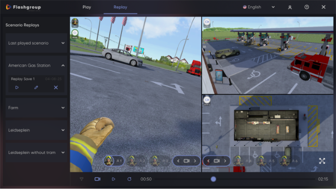 When a replay is opened, the saved scenario can be reviewed in full detail, with access to all available player points of view and CCTV cameras placed around the map, just like in the live scenario. Each camera can be toggled on or off, allowing you to focus only on the perspectives that are most relevant to your review.