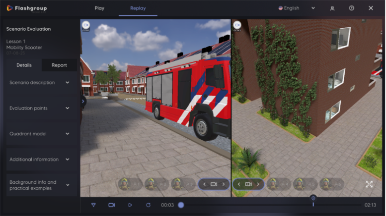 In the bottom-right corner of the camera view, a full screen button is available to expand the selected camera feed for a more immersive review. If the replay is from a lesson scenario, an information panel will appear on the left side of the screen, showing details about the lesson description, additional information, and evaluation points grader.