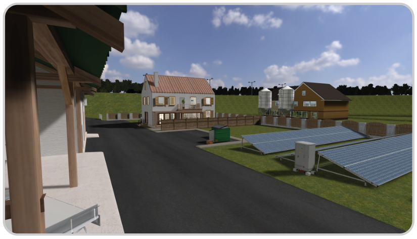Beyond typical farm structures, this environment reflects the growing emphasis on sustainability found on many modern Dutch farms. You'll find solar panels installed on rooftops, power distribution boxes, and electric equipment throughout the scene. These elements introduce opportunities for training in scenarios involving electrical systems and green energy infrastructure.