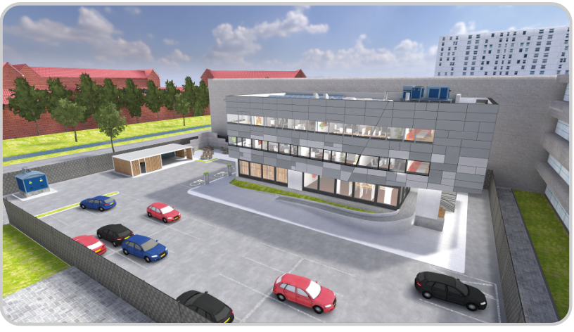 In line with Europe’s sustainability efforts, the scene also features solar panels on the roof and parking spaces for electric vehicles, allowing for specialized fire response training related to electric systems.
