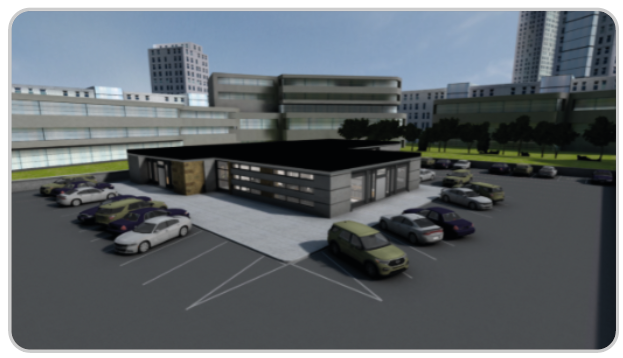 This environment features a multi-room office building that includes individual workspaces, meeting rooms, a recreation room, and a cafeteria. The building is surrounded by a parking lot filled with various vehicles.