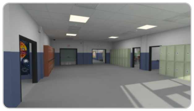 The layout is inspired by American school architecture, characterized by wide hallways and spacious classrooms. Each classroom is equipped with multiple rows of desks, creating a sense of a busy, active learning environment.