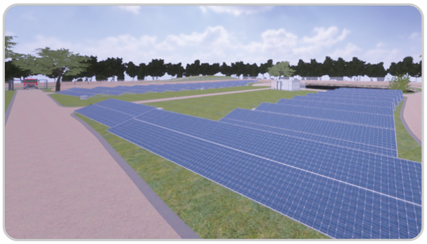 This environment is set in a large solar power park, featuring a central converter station and multiple rows of solar panels of varying sizes. The area is open and spacious, surrounded by a perimeter metal fence, providing a realistic renewable energy setting.