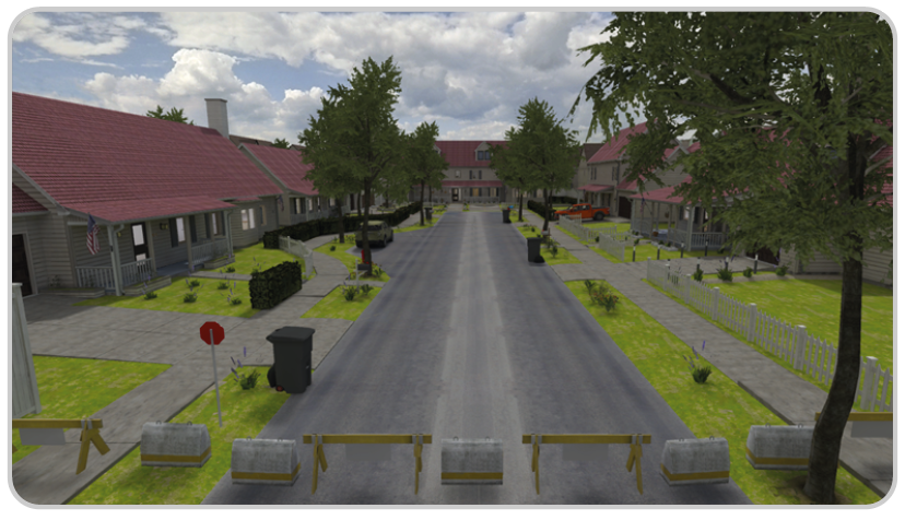 This environment is modeled after a typical American suburban street, featuring five houses that can be explored inside and out. The largest house, located at the end of the street, is designed for a small family, while the other homes are slightly smaller, suitable for two residents each. The neighborhood includes a mix of one- and two-story houses, and one house features a basement for added variety.